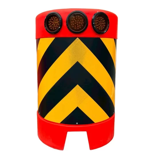 ผลิตจากพลาสติกอย่างดี มีความยืดหยุ่นเพื่อช่วยลดแรงกระแทก ขนาด 90 x 60 x 90 ซม. แบบพลังงานแสงอาทิตย์ ใช้งานต่อเนื่องได้มากกว่า 20 วัน โดยปราศจากแสงอาทิตย์ ใช้วางบริเวณหัวเกาะ เมื่อเกิดอุบัติเหตุรถพุ่งชน แบริเออร์หัวเกาะจะช่วยรับแรงกระแทกที่พุ่งเข้ามา สามารถช่วยป้องกันอันตรายได้ในระดับหนึ่ง เหมาะสำหรับงานก่อสร้าง งานซ่อมแซมถนน งานจัดระเบียบจราจร และงานป้องกันอุบัติเหตุ