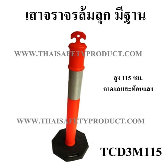 เสายางจราจรล้มลุก มีฐาน ชนิดนี้ ผลิตจากวัสดุที่มีความทนทาน โดยผลิตจาก EVA (Ethylene Vinyl Acetate) อย่างดี ซึ่งมีความเหนียว ทนทานต่อสภาพอากาศ แรงกระแทกได้ดี อายุการใช้งานนานกว่า พลาสติกทั่วไป หรือ ไฟเบอร์กลาส ไม่ก่อให้เกิดความเสียหายให้กับรถ มีความสูง 115 cm. สีส้มสดใส ป้องกัน UV ได้ สามารถมองเห็นได้ชัดเจน ทนทานต่อสภาพอากาศได้ดี สีไม่ซีด ใช้งานได้นาน มีฐาน เป็นฐานยาง 8 เหลี่ยม ช่วยรองรับน้ำหนัก สามารถติดตั้งได้ง่าย โดยไม่ต้องใช้พุก ยกเคลื่อนย้ายได้ง่าย มีแถบสะท้อนแสงขนาดใหญ่ ไม่หลุดล่อนง่าย ช่วยในการใช้งานในเวลากลางคืน อย่างมีประสิทธิภาพมากขึ้น ด้านบน มีรู สามารถร้อยโซ่กันเขตได้ เหมาะสำหรับ งานจราจร แบ่งเลนถนน เพื่อให้ผู้ขับขี่เห็นเลนถนน ได้อย่างชัดเจนขึ้น, ใช้แบ่งเส้นทางเดินรถ สวนเข้า สวนออก, ใช้กั้นเขตจราจร หรือ เป็นเสานำทางในเวลากลางคืนได้, ใช้บอกตำแหน่ง เส้นแบ่งช่องจราจร บริเวณหัวสะพาน หรือ บริเวณเกาะกลางถนน, ใช้บอกพื้นที่แขตก่อสร้าง หรือ ใช้ป้องกันเขตพื้นที่ห้ามเข้า หรือ พื้นที่ห้ามจอดรถ หรือ หรือ ยานพาหนะต่าง ๆ เพื่อป้องกันการเกิดอุบัติเหตุ ได้เป็นอย่างดี