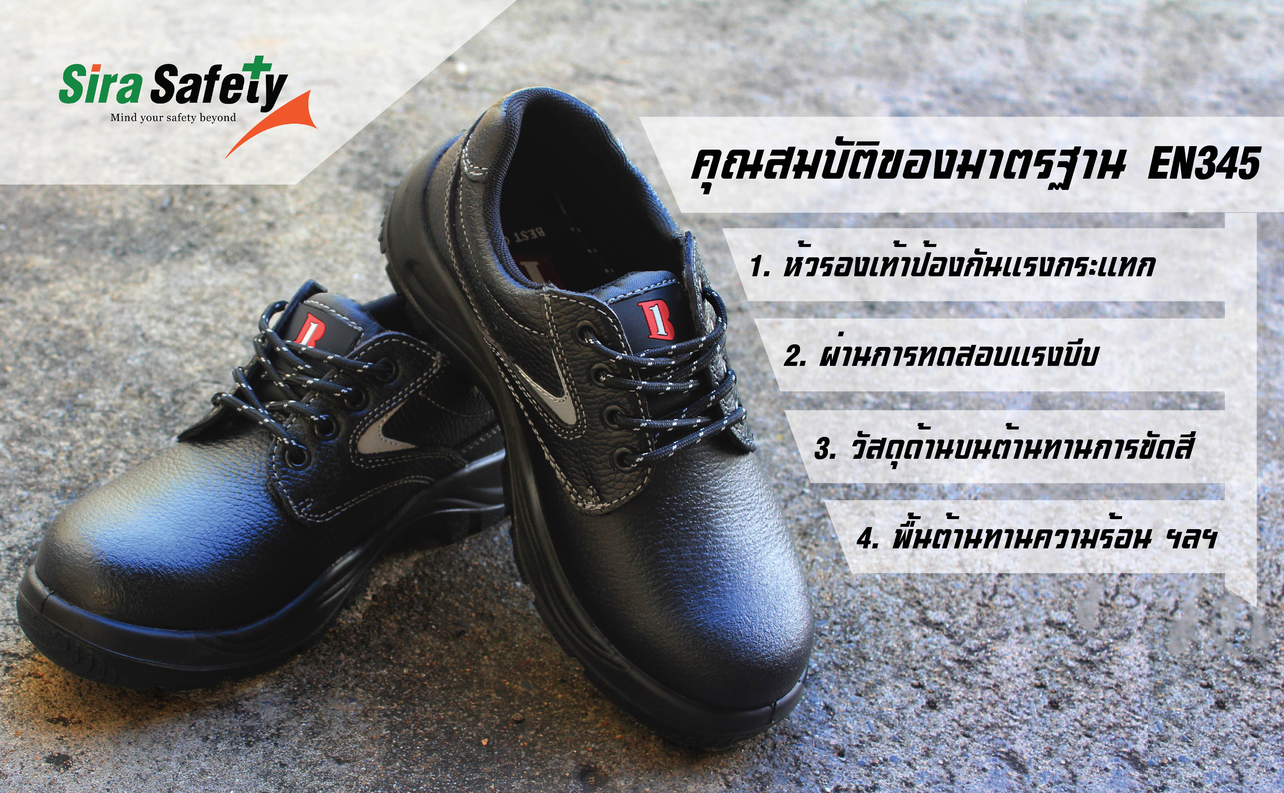 ผู้ใช้งานควรใช้รองเท้าเซฟตี้ให้เหมาะสมกับลักษณะงานเพื่อความปลอดภัยในการทำงานที่อาจจะเกิดขึ้นได้ตลอดเวลา ซึ่งรองเท้าเซฟตี้นั้นก็จำเป็นที่ต้องมีใบรับรองมาตรฐานสากลอย่างเช่น มาตรฐาน ยุโรป EN345 โดยรองเท้าเซฟตี้ที่ได้รับมาตรฐานนี้ ต้องมีคุณสมบัติเบื้องต้นดังนี้