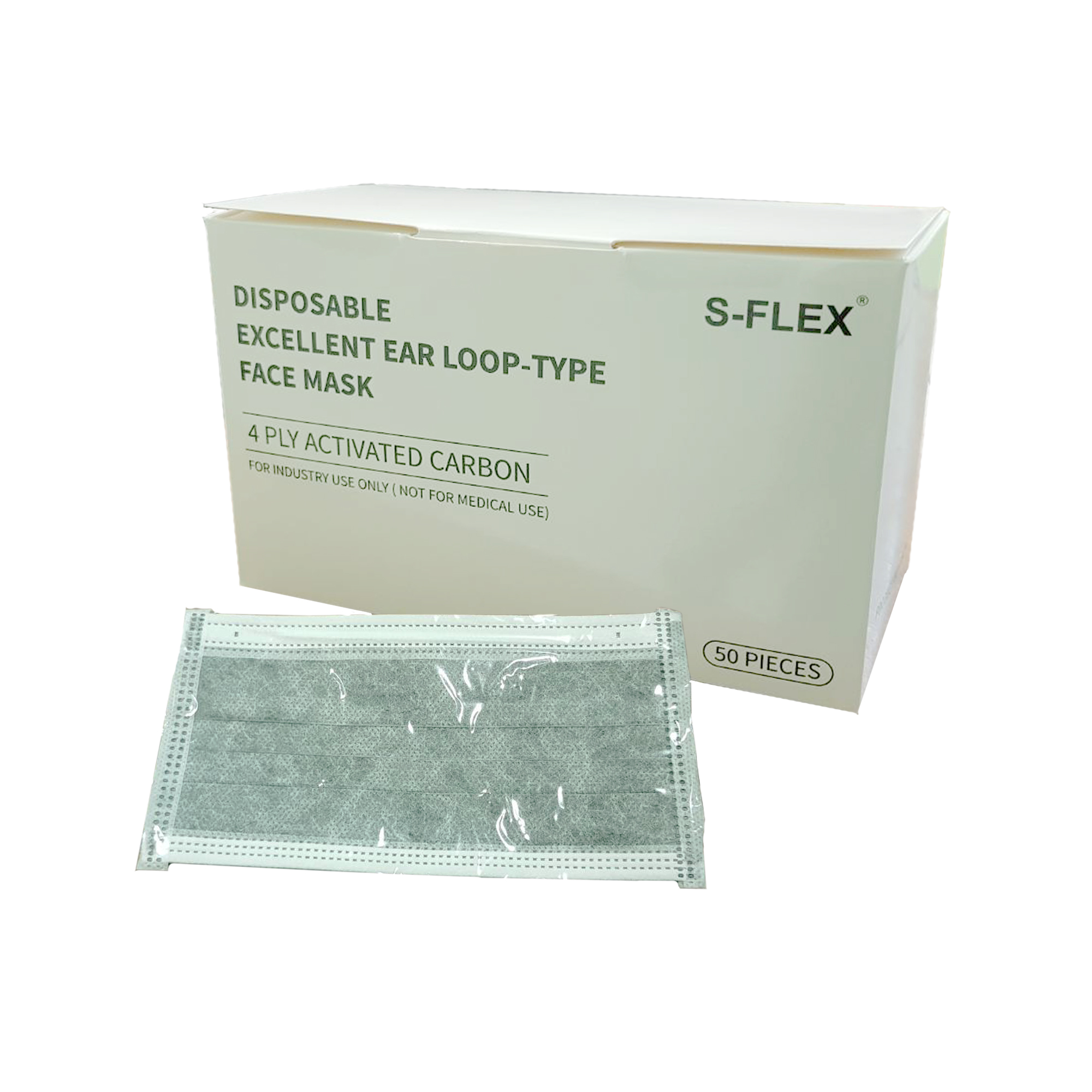 หน้ากากอนามัย กรองคาร์บอน 4 ชั้น แบบใช้แล้วทิ้ง ชนิดนี้ ผลิตจาก Non woven Fabric + Filter Paper 3 ชั้น เสริมด้วย ชั้น Activated Carbon อีก 1 ชั้น รวมเป็น 4 ชั้น เป็นหน้ากากที่สามารถ ป้องกันกลิ่นควัน ที่อาจเป็นอันตรายต่อร่างกาย สายคล้องหู เป็นแบบสายกลม คุณภาพดี มีความกระชับพอดี ไม่เจ็บหูเวลาสวมใส่ บริเวณด้านบน เสริมด้วยแถบอลูมิเนียม ที่สามารถดัดได้ สำหรับปรับความกระชับได้ตามต้องการ ขนาดต่อชิ้น จะอยู่ที่ประมาณ 175 x 95 mm. โดย 1 กล่อง จะบรรบุ 50 ชิ้น โดยแต่ละชิ้น จะบรรจุแยกซองกัน เพื่อความสะอาดที่มากกว่า เหมาะสำหรับ ใช้ป้องกันกลิ่นควัน สารพิษ งานพ่นสี งานจราจร ขับขี่รถจักรยานยนต์ อีกทั้ง ยังสามารถใช้กับ สถานพยาบาล คลีนิค เพื่อกันเชื้อแบคทีเลียได้อีกด้วย