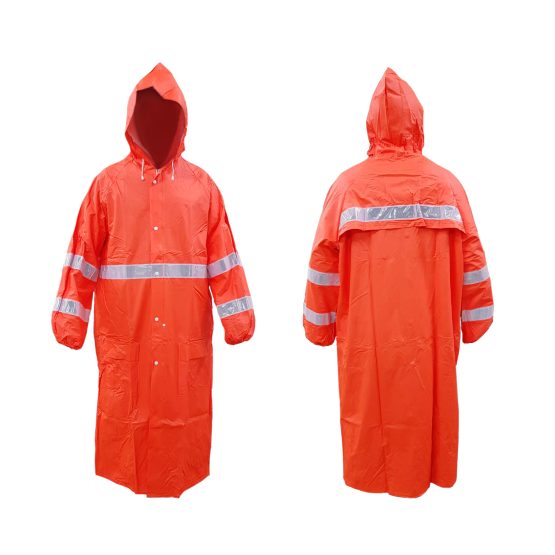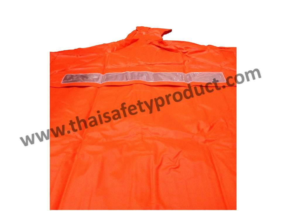 เสื้อกันฝน สะท้อนแสง คุณภาพสูง แบบเสื้อคลุม ผลิตจากผ้า PVC ทีมีความหนา อย่างดี จำนวน 2 ชั้น โดยชุดกันฝนชนิดนี้ ตัดเย็บด้วยเครื่องรีดร้อน แทนการตัดเย็บ สามารถป้องกันน้ำเข้าได้ 100% มีความทนทาน ไม่ฉีกขาดง่าย มีสีส้มสด มองเห็นได้จากระยะไกล มีหมวกคลุมศีรษะ พร้อมเชือก ปรับความกระชับได้ ด้านหลัง ติดแถบสะท้อนแสง PVC จำนวน 1 แถบ มีความกว้าง 2 นิ้ว ช่วยสะท้อนแสงในเวลากลางคืนได้ดี มีรูระบายอากาศ ด้านหลัง ทำให้ใช้งานได้เป็นเวลานาน ด้านหน้าเป็นซิปยาว และติดกระดุมสแน็ปปิดทับ ช่วยให้สามารถกันน้ำได้ดียิ่งขึ้น มีกระเป๋าด้านหน้า จำนวน 2 ใบ ชุดกันฝนชนิดนี้ เป็นแบบฟรีไซซ์ สามารถใช้งานได้หลายครั้ง น้ำไม่ซึมเข้าด้านในเมื่อโดนน้ำเป็นเวลานาน ซักล้างง่าย เหมาะสำหรับ งานตำรวจจราจร งานวิศวกร รปภ. งานก่อสร้าง หน่วยกู้ภัย งานสนามบิน หรือผู้ขับขี่รถจักรยานยนต์ เป็นต้น