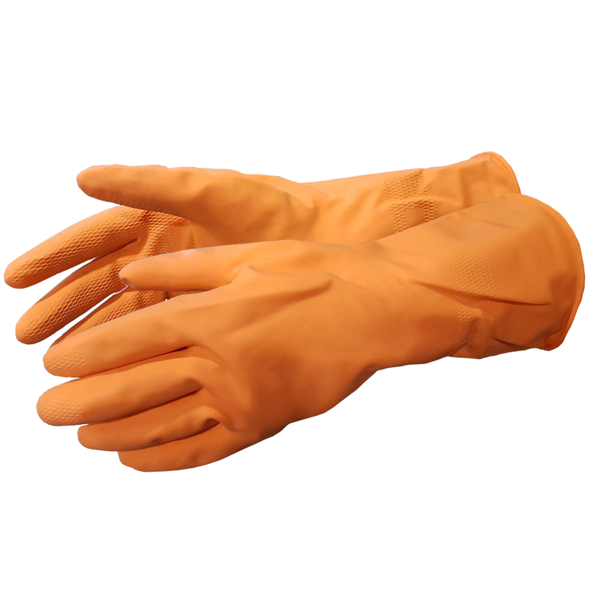 ถุงมือยางสีส้ม เสริมซับใน มีความหนา 0.45 มิล ยาว 33 ซม. ผลิตจากยางธรรมชาติ สวมใส่ได้สบาย เหมาะสมกับการใช้ป้องกันคราบเปรอะเปื้อน, ป้องกันไขมันสัตว์, ป้องกันยาฆ่าแมลง, ป้องการเกิดบาดแผล เป็นถุงมือที่ความคงทน สามารถใช้ได้นาน หลังใช้งานแล้ว สามารถนำถุงมือมาทำความสะอาด แล้วกลับมาใช้ได้ใหม่ โดย 1 กล่อง บรรจุ 12 คู่