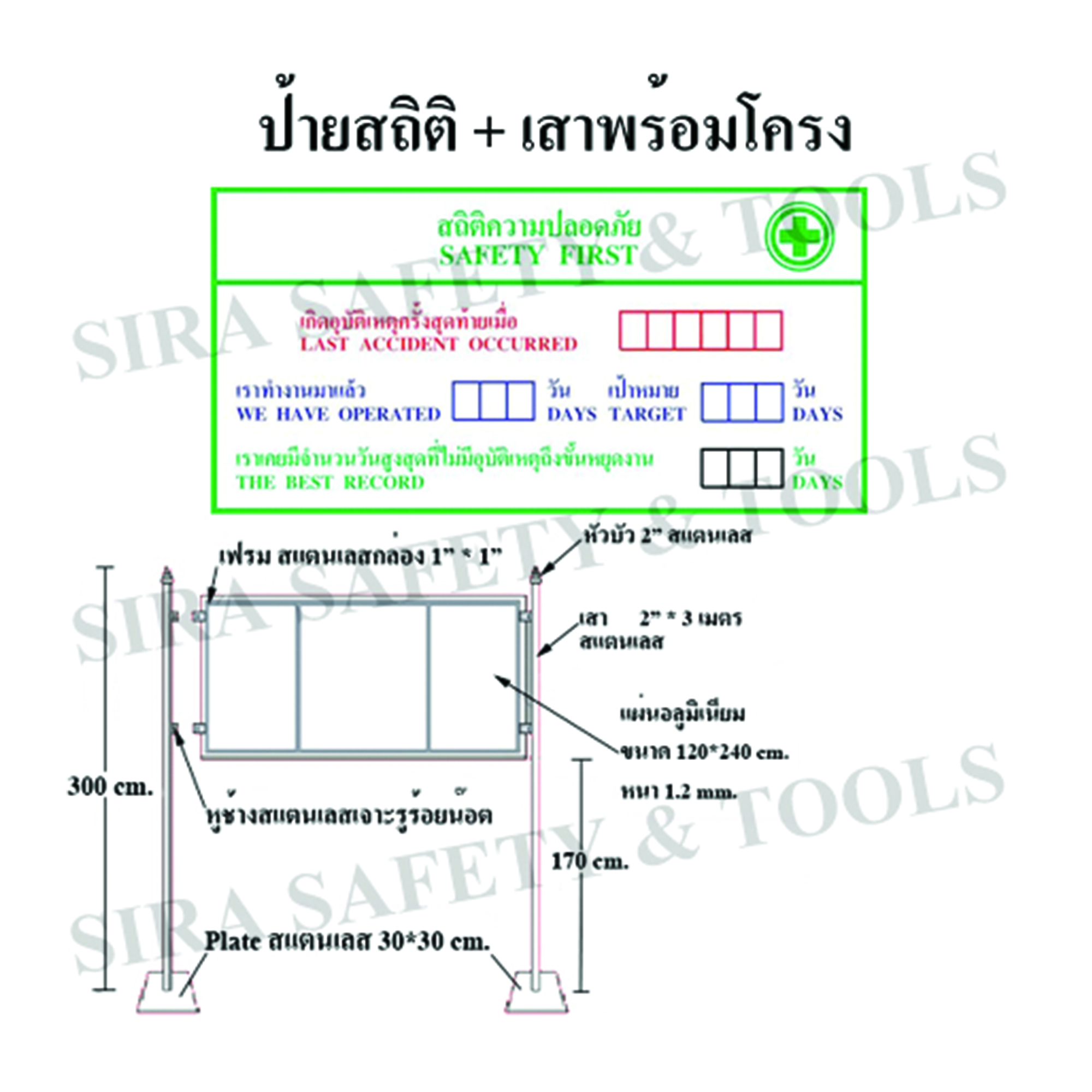 1. ป้ายสถิติความปลอดภัย ทำจากแผ่นอลูมิเนียม มีให้เลือกแบบ หนา 1.2 มิล, และ 2 มิล