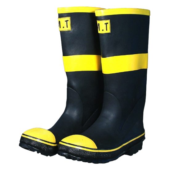 รองเท้าบูท ดับเพลิง ยี่ห้อ MT ชนิดนี้ เป็นรองเท้าดับเพลิง ที่ผลิตจาก ยางสังเคราะห์ ที่สามารถกันความร้อน กันไฟไหม้ กันน้ำมัน ผลิตตามมาตรฐาน กรมตำรวจดับเพลิง อีกทั้งสามารถ กันสารเคมี กรดด่าง และไขมัน ได้ดี ด้านใน บุผ้าฝ้ายทั้งชิ้น กันความร้อน ตัวรองเท้า มีความสูง 15 นิ้ว สูงถึงประมาณบริเวณเข่า หัวของรองเท้าเป็นหัวเหล็ก (Toe cap) ป้องกันแรงกระแทก 200 จูล ป้องกันของหล่นทับ หรือป้องการกระแทก พื้นรองเท้า เป็นพื้นเสริมแผ่นเหล็ก (Steel mid sole) กันตะปู กันของแหลมคมทิ่ม พื้นรองเท้า ปั๊มลายดอกยางแบบพิเศษ ป้องกันการลื่นไถล กันไฟฟ้าสถิต และ ยังทนทานต่อความร้อน ได้ดี สามารถเลือกขนาด โดยจะมีไซซ์ 40 – 44 รองเท้าชนิดนี้ เป็นแบบไม่มีหูหิ้ว เหมาะสำหรับ งานซ้อมดับเพลิง ใช้งานได้ทนทาน มีความแข็งแรง ตัวยางไม่ขาดง่าย ใช้งานหนักได้ดี มีสีเหลือง ดำ