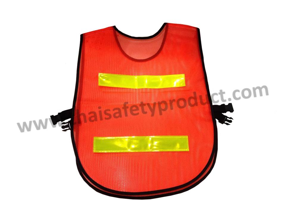 เสื้อกั๊กจราจร สีส้ม แถบสะท้อนแสงสีเขียว ชนิดสวมหัว เป็นผลิตภัณฑ์เพื่อความปลอดภัย ที่ทางเราได้ผลิตขึ้น เพราะเราได้คำนึงถึงความปลอดภัยของคนงาน ที่จำเป็นต้องทำงานกลางแจ้ง ไม่ว่าจะเป็นกลางวันหรือกลางคืน โดยผู้ที่สวมเสื้อกั๊กชนิดนี้ จะสามารถถูกมองเห็นได้จากระยะไกล ซึ่งจะช่วยลดอุบัติเหตุที่อาจจะเกิดขึ้นกับบุคคลอื่นๆ หรือกับผู้ปฏิบัติงานเอง เหมาะสำหรับ งานก่อสร้าง งานซ่อมบำรุง งานจราจร งานสนามบิน งานตำรวจ รปภ. เป็นต้น โดยเสื้อกั๊กชนิดนี้ ผลิตจากเส้นใย ไนล่อน สีส้ม ที่ถักแบบตาข่าย ทำให้สวมใส่ได้สบาย ไม่ร้อน บริเวณด้านหน้าและด้านหลัง คาดด้วยแถบสะท้อนแสง สีเขียว ฝั่งละ 2 แถบ โดยตัวแถบ กว้าง 2 นิ้ว ยาว 12 นิ้ว แถบเป็นแบบ PVC ซึ่งมีความทนทานสูง ด้านข้างของเสื้อกั๊ก เป็นตัวล็อค แบบก้ามปู เป็นขนาดฟรีไซซ์ สามารถซักล้าง ทำความสะอาดได้ สีของตัวเสื้อและแถบสะท้อนแสง ไม่ซีดง่าย ใช้งานได้ยาวนาน หลังจากซักแล้ว ควรเอาไปผึ่งให้แห้งให้ที่ร่ม จะทำให้ตัวเสื้อทรงสภาพได้ดีกว่า สามารถยืดอายุการใช้งานได้ยาวนานขึ้น บริเวณแถบสะท้อนแสง สามารถสั่งติดโลโก้ได้ เพื่อเพิ่มความสวยงาม และความเป็นอัตลักษณ์ของผู้ใช้งาน