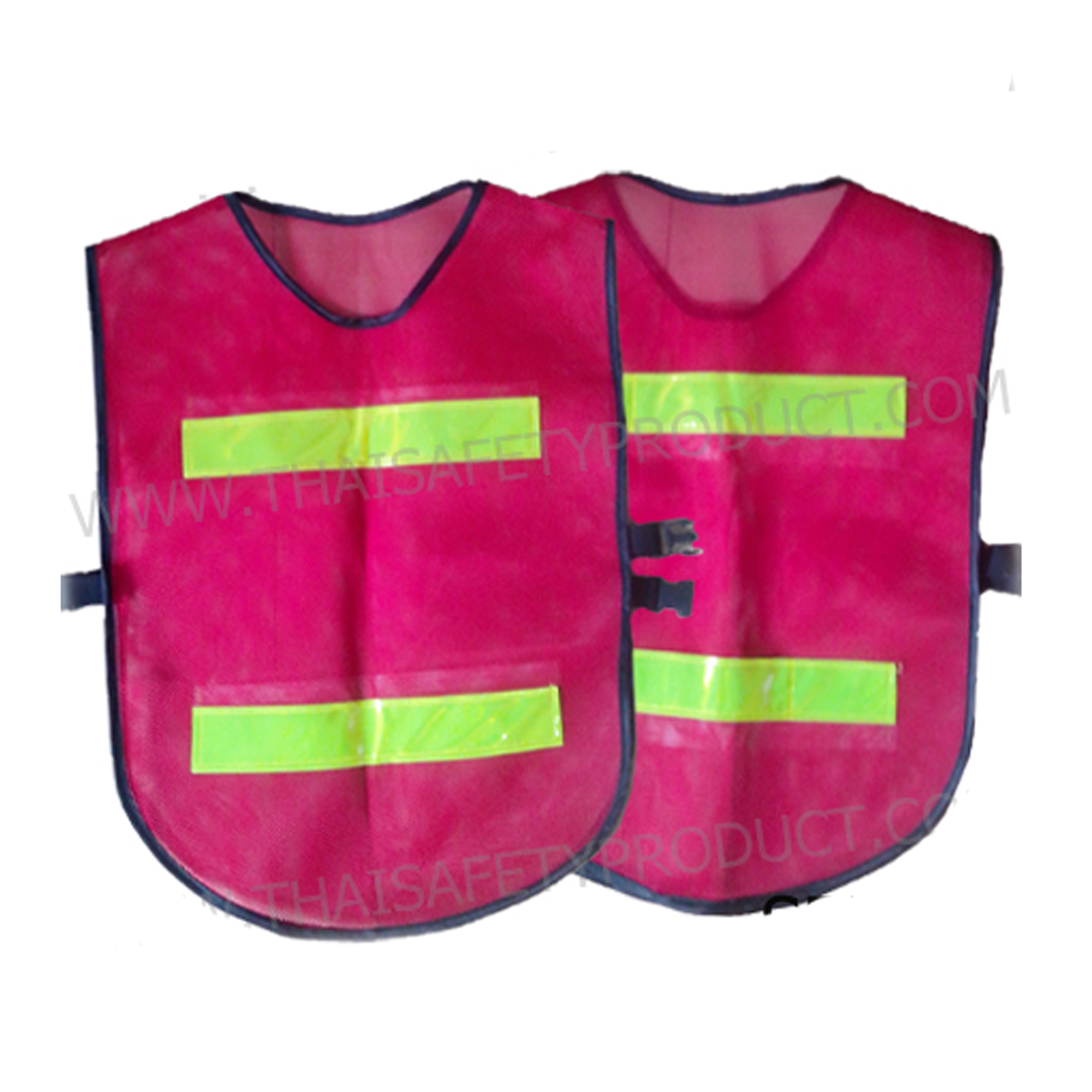 เสื้อกั๊กจราจร สีแดง แถบสะท้อนแสงสีเขียว ชนิดสวมหัว เป็นผลิตภัณฑ์เพื่อความปลอดภัย ที่ทางเราได้ผลิตขึ้น เพราะเราได้คำนึงถึงความปลอดภัยของคนงาน ที่จำเป็นต้องทำงานกลางแจ้ง ไม่ว่าจะเป็นกลางวันหรือกลางคืน โดยผู้ที่สวมเสื้อกั๊กชนิดนี้ จะสามารถถูกมองเห็นได้จากระยะไกล ซึ่งจะช่วยลดอุบัติเหตุที่อาจจะเกิดขึ้นกับบุคคลอื่นๆ หรือกับผู้ปฏิบัติงานเอง เหมาะสำหรับ งานก่อสร้าง งานซ่อมบำรุง งานจราจร งานสนามบิน งานตำรวจ รปภ. เป็นต้น โดยเสื้อกั๊กชนิดนี้ ผลิตจากเส้นใย ไนล่อน สีแดง ที่ถักแบบตาข่าย ทำให้สวมใส่ได้สบาย ไม่ร้อน บริเวณด้านหน้าและด้านหลัง คาดด้วยแถบสะท้อนแสง สีเขียว ฝั่งละ 2 แถบ โดยตัวแถบ กว้าง 2 นิ้ว ยาว 12 นิ้ว แถบเป็นแบบ PVC ซึ่งมีความทนทานสูง ด้านข้างของเสื้อกั๊ก เป็นตัวล็อค แบบก้ามปู เป็นขนาดฟรีไซส์ สามารถซักล้าง ทำความสะอาดได้ สีของตัวเสื้อและแถบสะท้อนแสง ไม่ซีดง่าย ใช้งานได้ยาวนาน หลังจากซักแล้ว ควรเอาไปผึ่งให้แห้งให้ที่ร่ม จะทำให้ตัวเสื้อทรงสภาพได้ดีกว่า สามารถยืดอายุการใช้งานได้ยาวนานขึ้น บริเวณแถบสะท้อนแสง สามารถสั่งติดโลโก้ได้ เพื่อเพิ่มความสวยงาม และความเป็นอัตลักษณ์ของผู้ใช้งาน