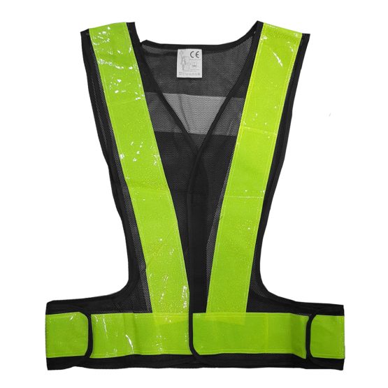 เสื้อกั๊กสะท้อนแสง สีเขียว ทรงวี ตัดเย็บจากตาข่ายสีดำ เดินกุ้นสีดำรอบตัว ติดแถบสะท้อนแสง แบบ PVC สีเขียว ที่ได้มาตรฐาน มีความทนทานสูง ไม่ซีดจางได้ง่าย และยังทำความสะอาดได้ง่าย มี Fluorescent (กากเพชร) สามารถสะท้อนแสงได้ดี ขนาดความกว้าง 3 นิ้ว ตัวเสื้อกั๊กมีความยาว 24 นิ้ว ด้านหน้า ติดด้วยแถบเมจิกเทป สีดำ ความยาว 9.5 นิ้ว ชายเสื้อกั๊กจราจรด้านข้าง สามารถปรับขนาดความกว้างของเอวได้กว้างสุด 42 นิ้ว เหมาะสำหรับงานจำพวก งานจราจร รปภ. ตำรวจ งานก่อสร้าง งานซ่อมบำรุง หรือแม้กระทั้งผู้ขับขี่รถจักรยานยนต์และจักรยาน ด้านหลังของเสื้อกั๊ก มีแถบคาดหลัง สามารถติดโลโก้ต่าง ๆ เพื่อเพิ่มความสวยงามได้ ใช้งานได้ดีในกลางแจ้ง แม้กระทั่งในขณะที่ฝนตก เพราะตัวแถบสะท้อนแสงสามารถโดนน้ำได้ โดยไม่มีการลอก ทำให้ใช้งานได้ยาวนาน